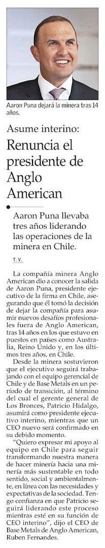 Aaron Puna renuncia a la presidencia ejecutiva de Anglo American en Chile - (Diario Financiero)
