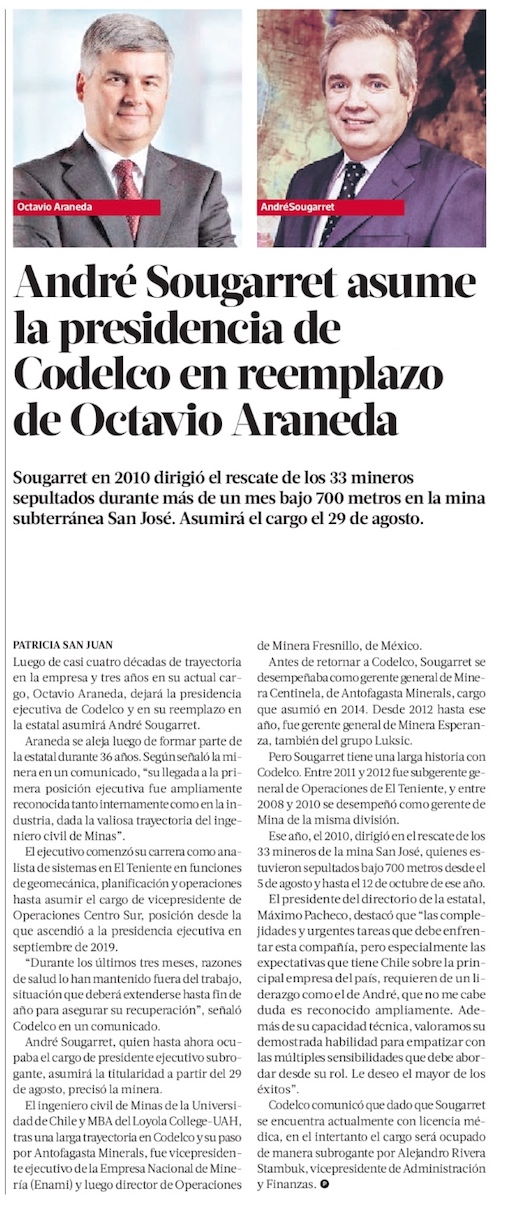 Ingeniero que rescató a 33 mineros, André Sougarret, es el nuevo presidente ejecutivo de la estatal - (El Mercurio de Santiago)