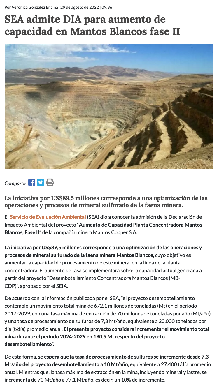 Mantos Blancos ingresa proyecto al SEA que aumenta la capacidad de su concentradora - (El Mercurio de Antofagasta)