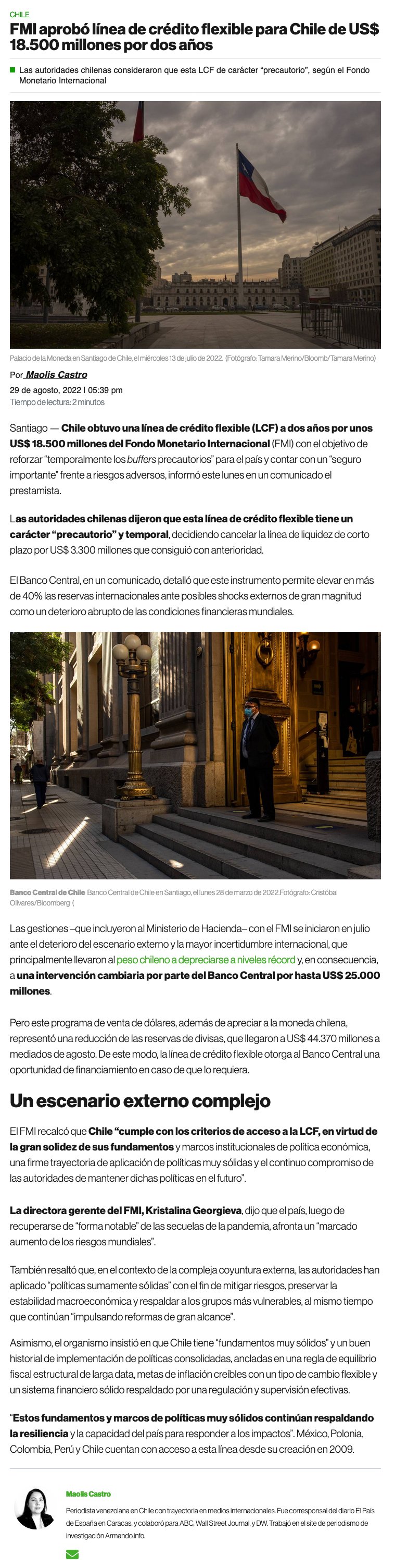 Chile se blinda ante shocks externos con nueva línea del FMI: dispondrá de US$ 18.500 millones por dos años - (Diario Financiero)