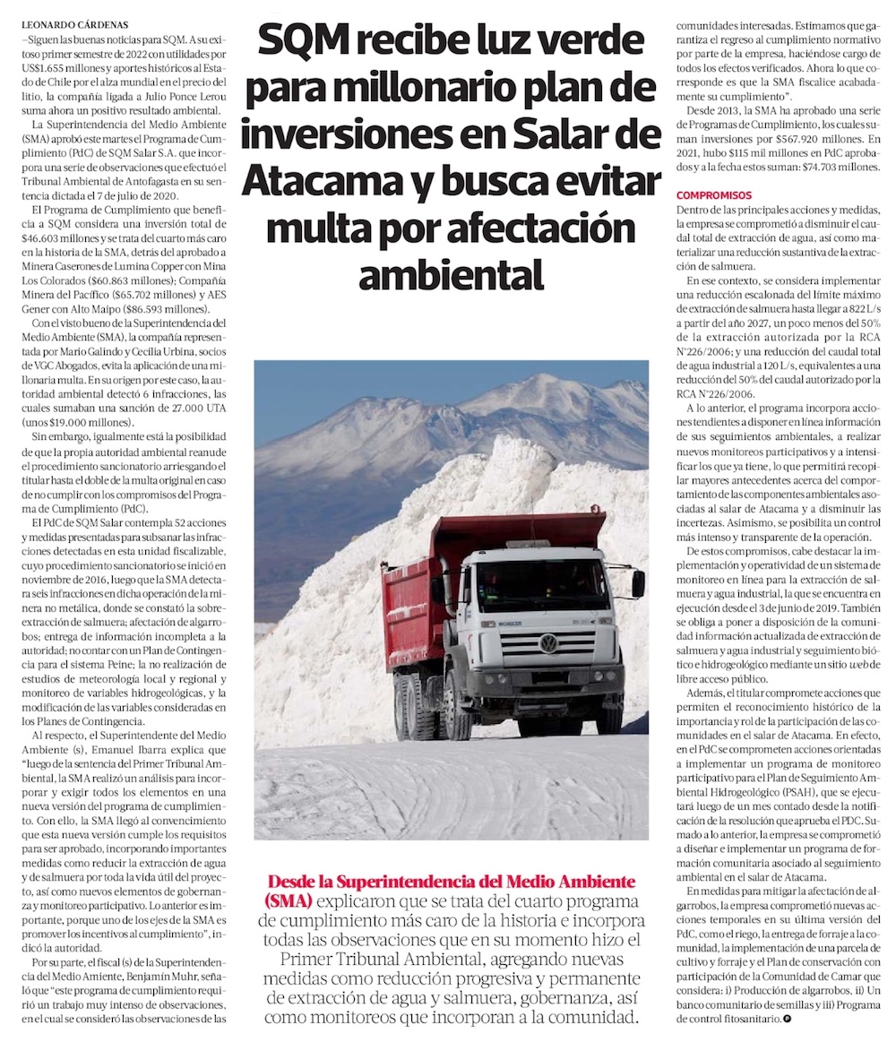 SMA da luz verde a programa de cumplimiento de SQM que representa inversiones por más de US$ 51 millones - (El Mercurio de Santiago)