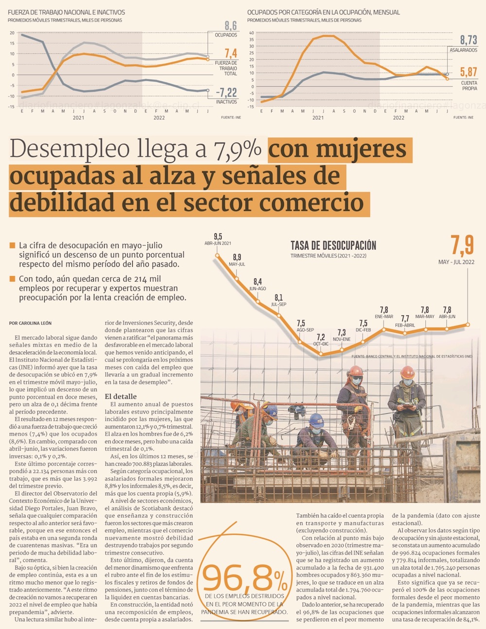 Creación de puestos de trabajo se estanca en julio y restan más de 500 mil empleos para recuperar nivel prepandemia - (Pulso)