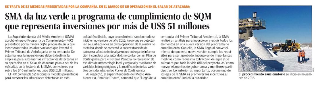 SMA aprueba programa de cumplimiento para SQM Salar por más de $ 46 mil millones - (Diario Financiero)