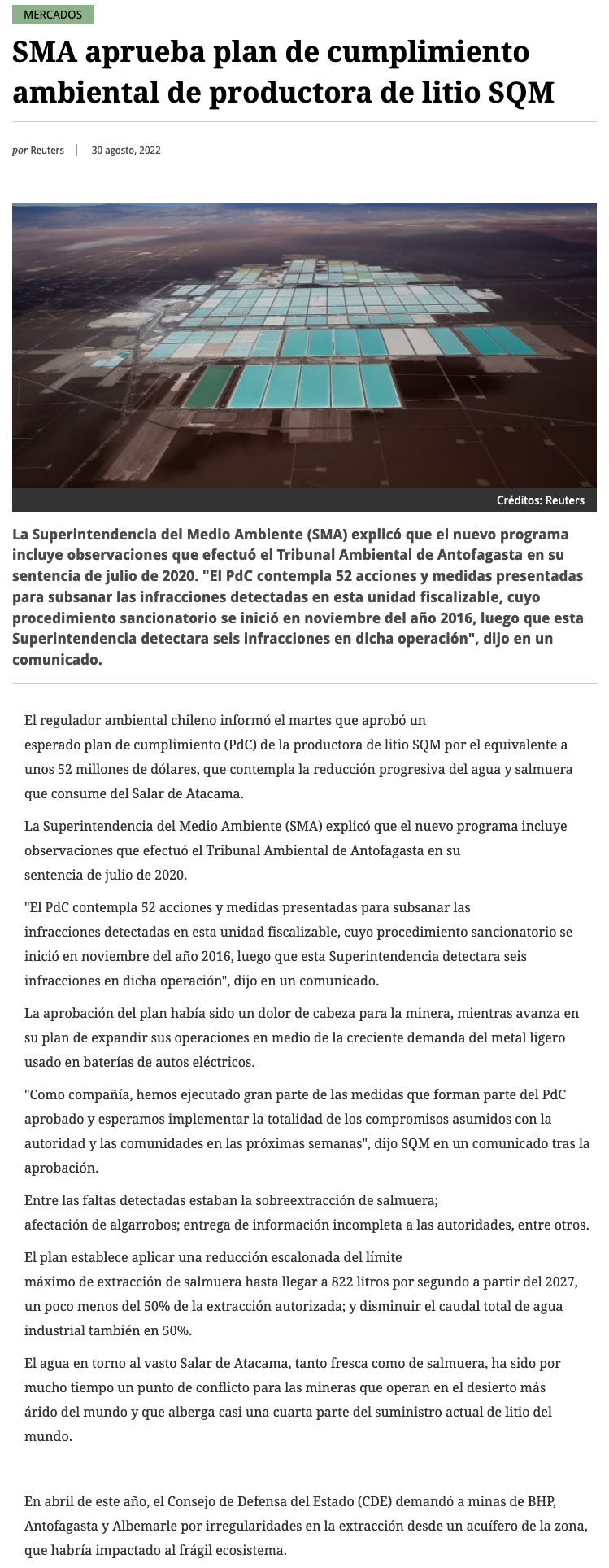 SMA da luz verde a programa de cumplimiento de SQM que representa inversiones por más de US$ 51 millones - (El Mercurio de Santiago)
