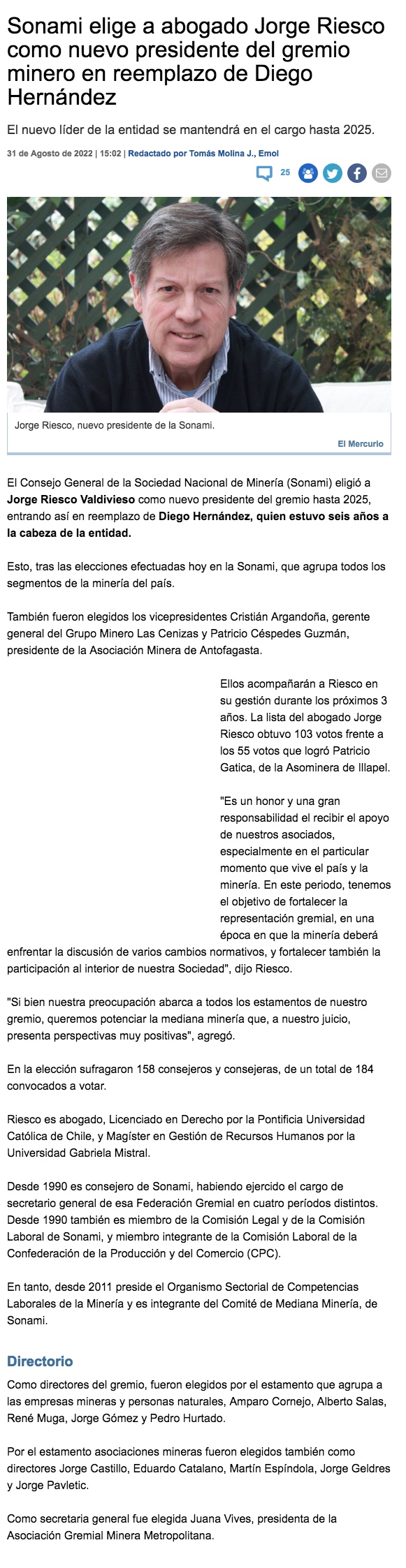 Jorge Riesco es elegido como el nuevo presidente de la Sonami en reemplazo De Diego Hernández - (El Mercurio de Santiago)