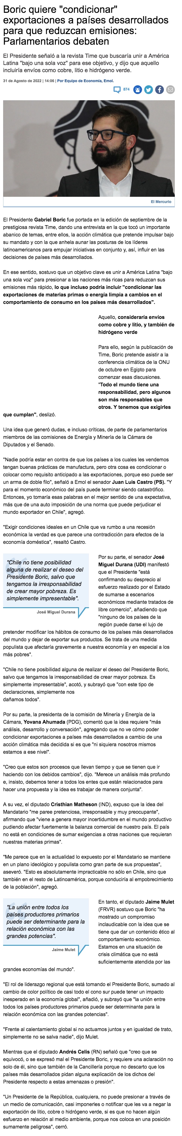 Se encienden el de polémica por idea de Boric de “condicionar” exportaciones de materias primas - (El Mercurio de Santiago)