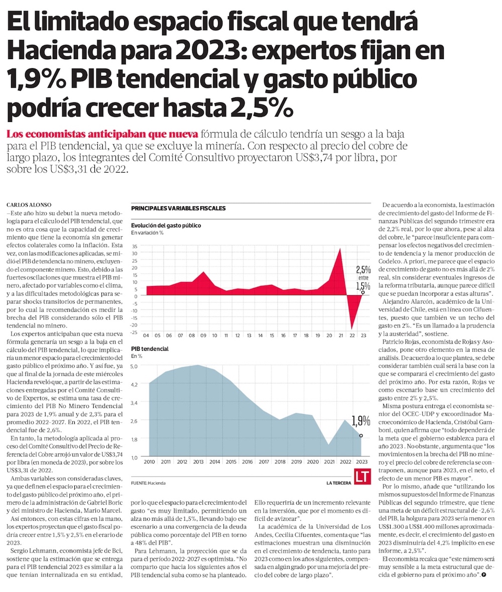 Presupuesto Fisco tendrá espacio acotado para gastar en 2023 con nuevos parámetros de PIB y cobre - (Diario Financiero)