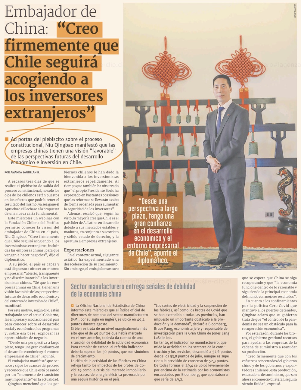 "Las empresas chinas tienen una visión favorable de las perspectivas futuras de Chile" - (Pulso)