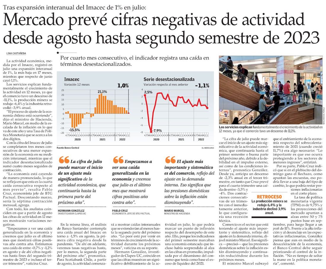 La economía salva julio con alza de 1%, pero desde agosto hasta mediados de 2023 solo sabría de bajas - (Diario Financiero)