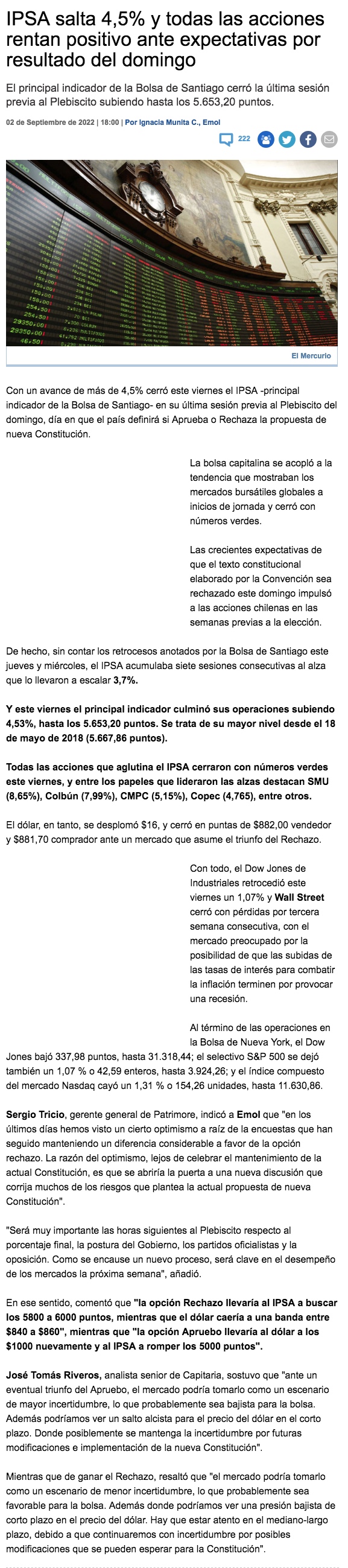 Mercado celebra holgado triunfo del Rechazo y proyecta fuerte rally en activos chilenos - (El Mercurio de Santiago)
