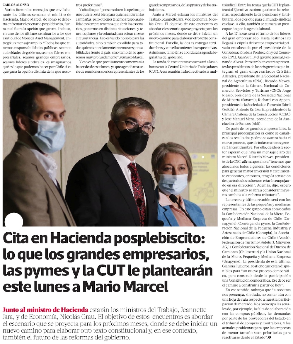 Hacienda convoca a cúpula empresarial y a la CUT para abordar escenario económico tras el plebiscito - (El Mercurio de Santiago)