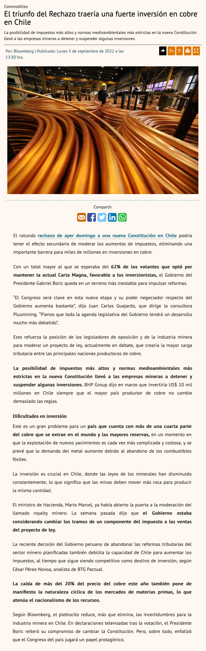 Bloomberg tras plebiscito: El voto aplastante abre la puerta a inversiones multimillonarias en el cobre - (La Tercera Online)