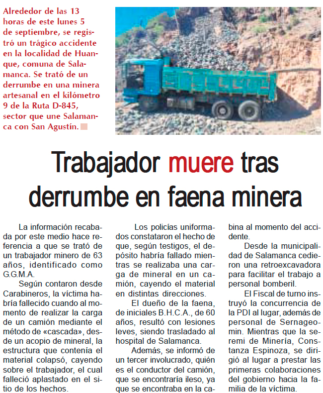 Accidente minero en Choapa termina con un trabajador fallecido - (El Día)