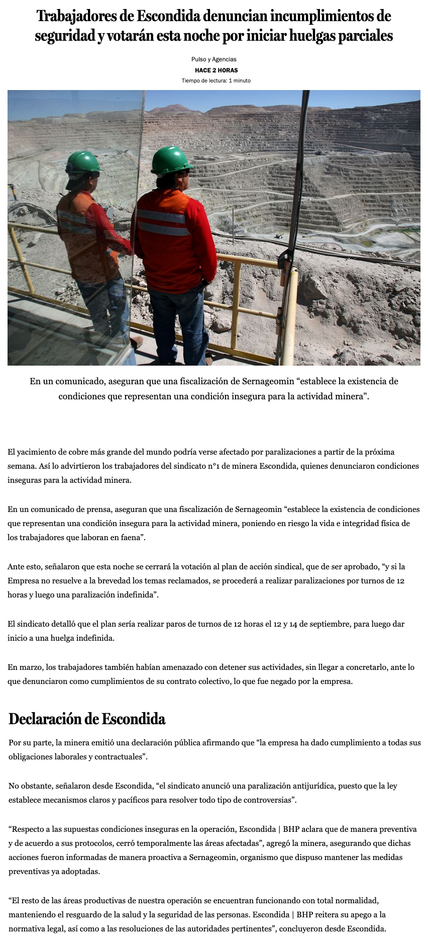 Sindicato de Minera Escondida amenaza con paro y empresa advierte de ilegalidad - (El Mercurio de Santiago)