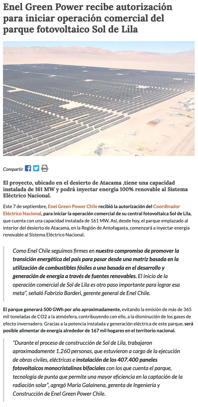Enel Green Power Chile recibe autorización para iniciar operaciones del parque fotovoltaico Sol de Lila - (DF Online)