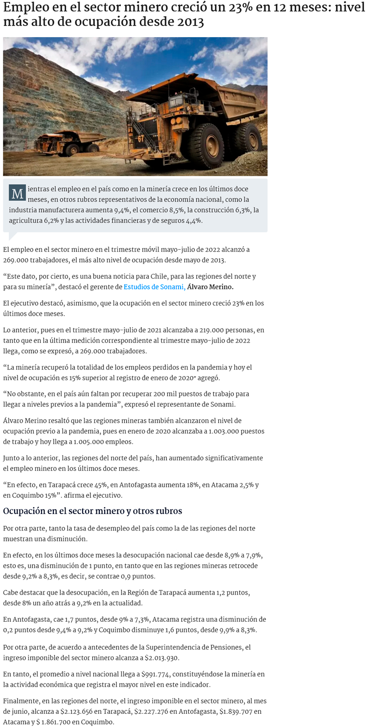 Empleo minero sigue en alza y anota aumento de 23% en un año, según análisis de la Sonami - (norteminero online)