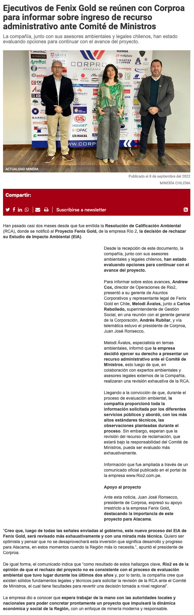 "Río 2" analiza opciones para avanzar con Fenix Gold - (El Diario de Atacama)