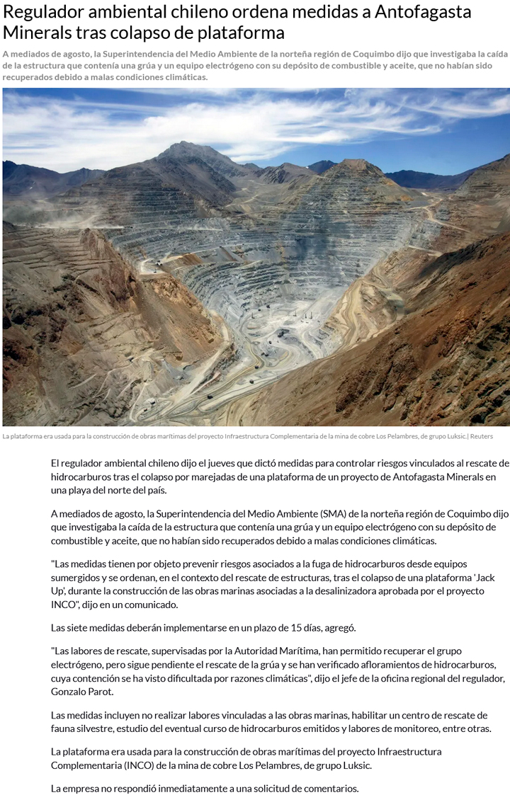 SMA ordena medidas contra proyecto de Pelambres - (El Mercurio de Santiago)