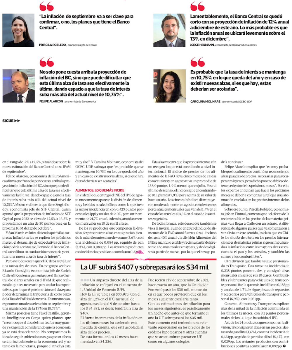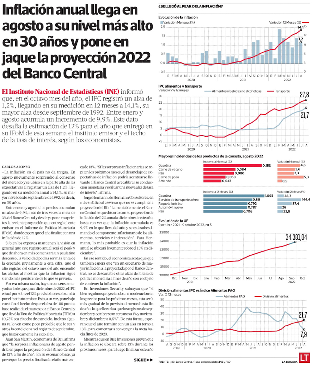 Inflación se dispara a mayor nivel en 30 años y presiona al BC para extender ciclo de alza de tasas - (El Mercurio de Santiago)