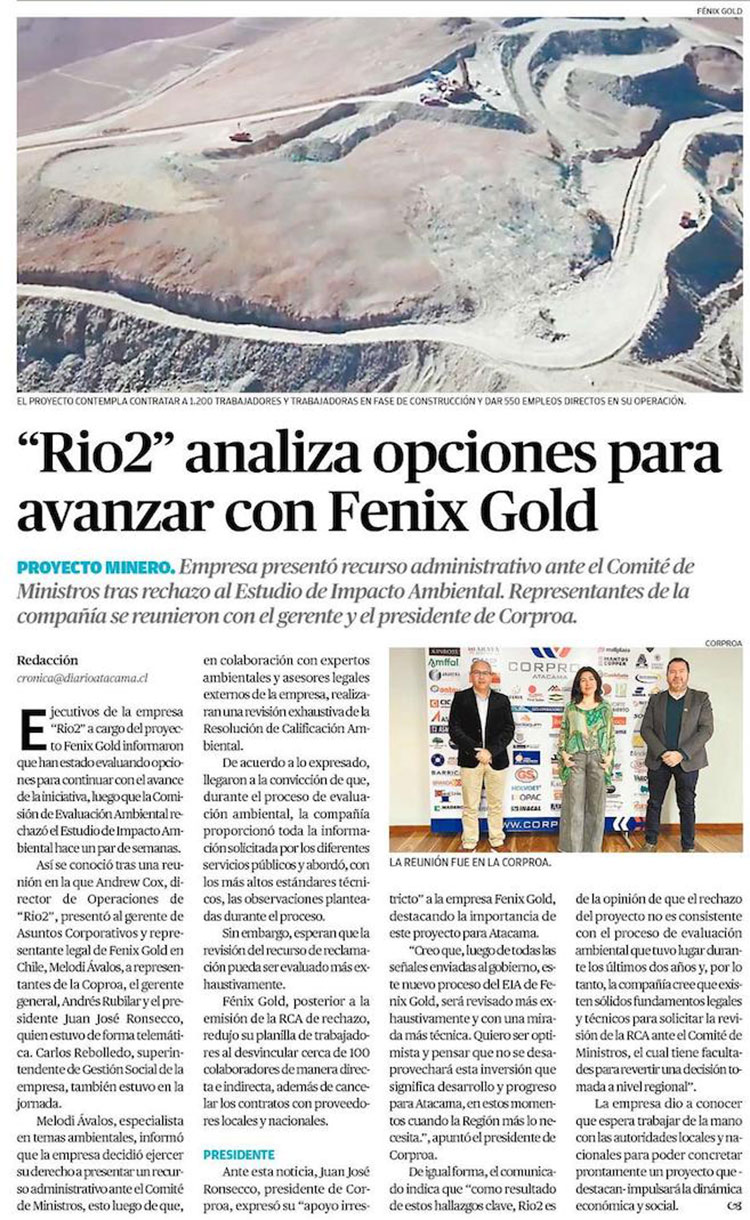 Ejecutivos de Fenix Gold se reúnen con Corproa para informar sobre ingreso de recurso administrativo ante Comité de Ministros - (mch.cl)