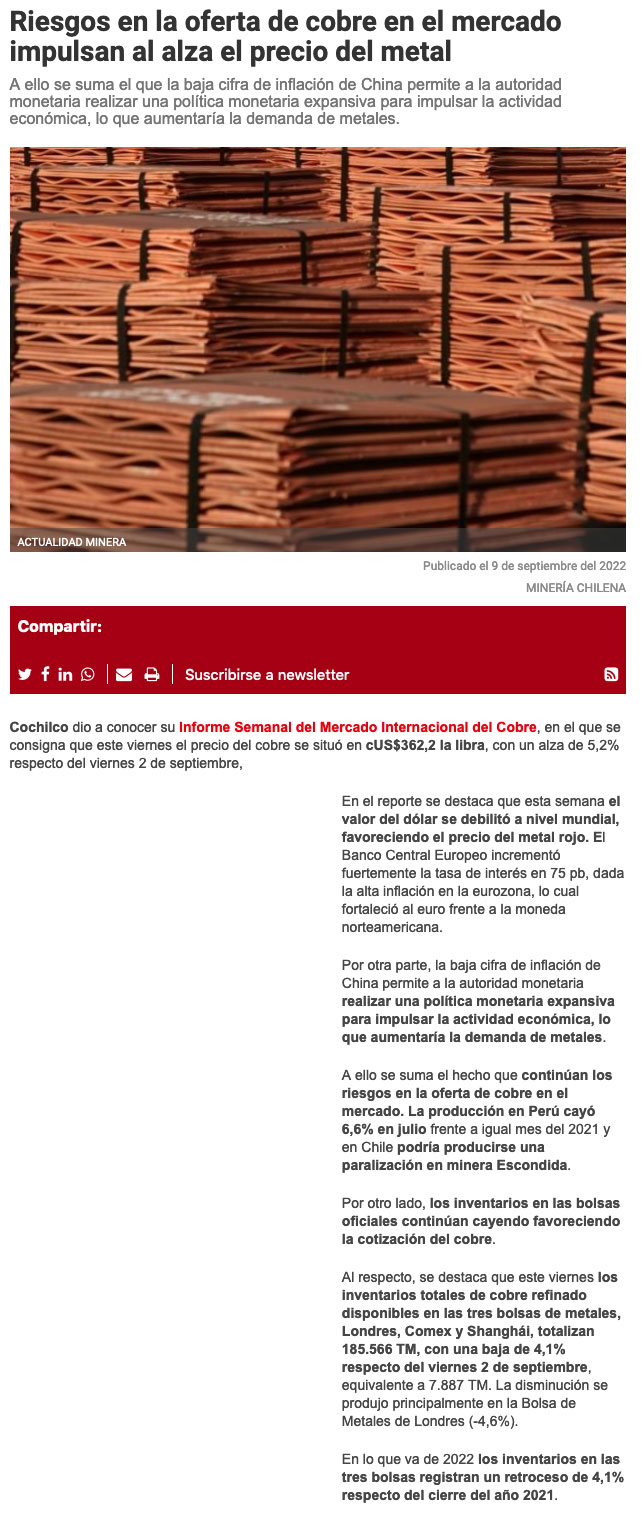 Mercado del cobre muestra señales de escasez de oferta - (El Mercurio de Santiago)