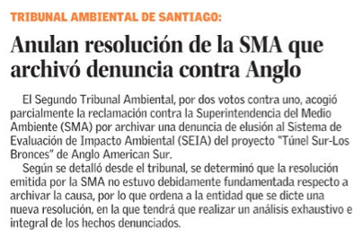 Tribunal Ambiental anuló resolución de la SMA que archivó denuncia contra Anglo American - (Diario Financiero)