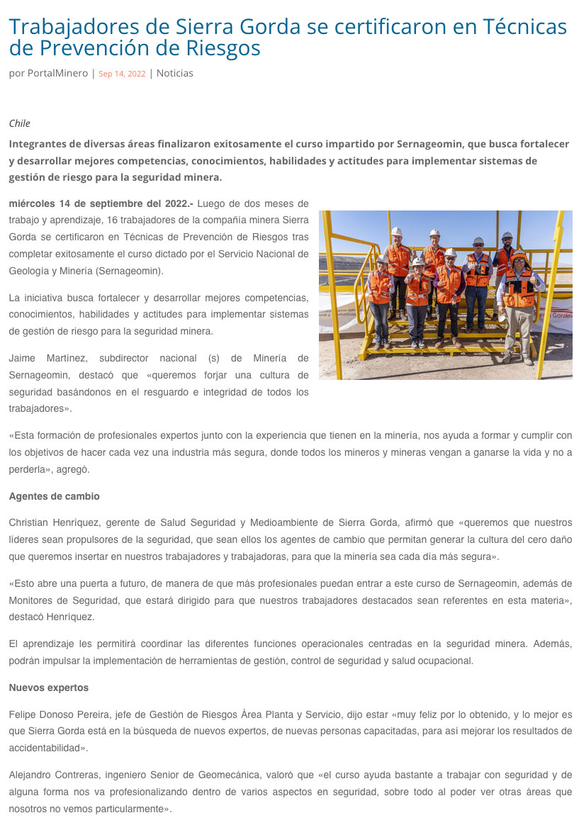 Trabajadores de Sierra Gorda SCM reciben certificación de Sernageomin en Técnicas de Prevención de Riesgos - (elamerica)