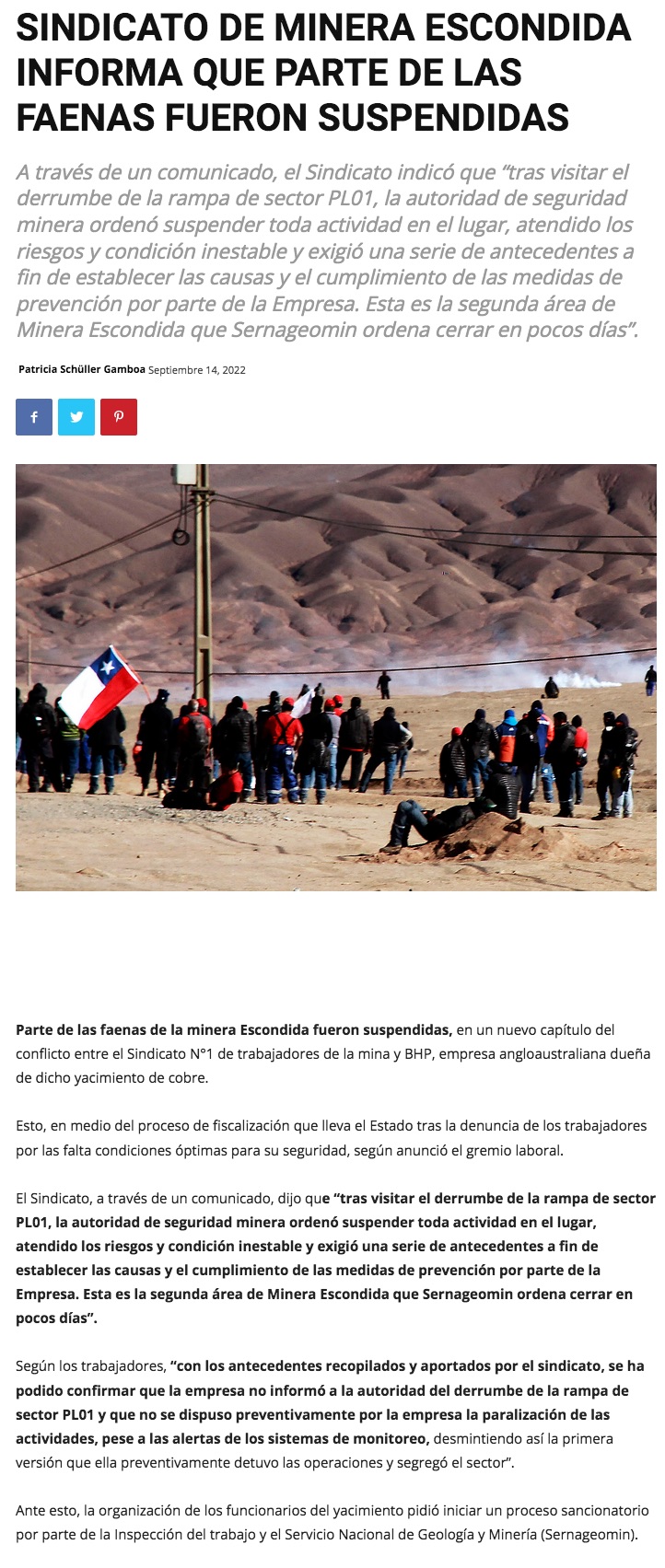 Sindicato anuncia que parte de las faenas en Escondida fueron suspendidas por parte de la autoridad y empresa refuta - (Pulso Online)