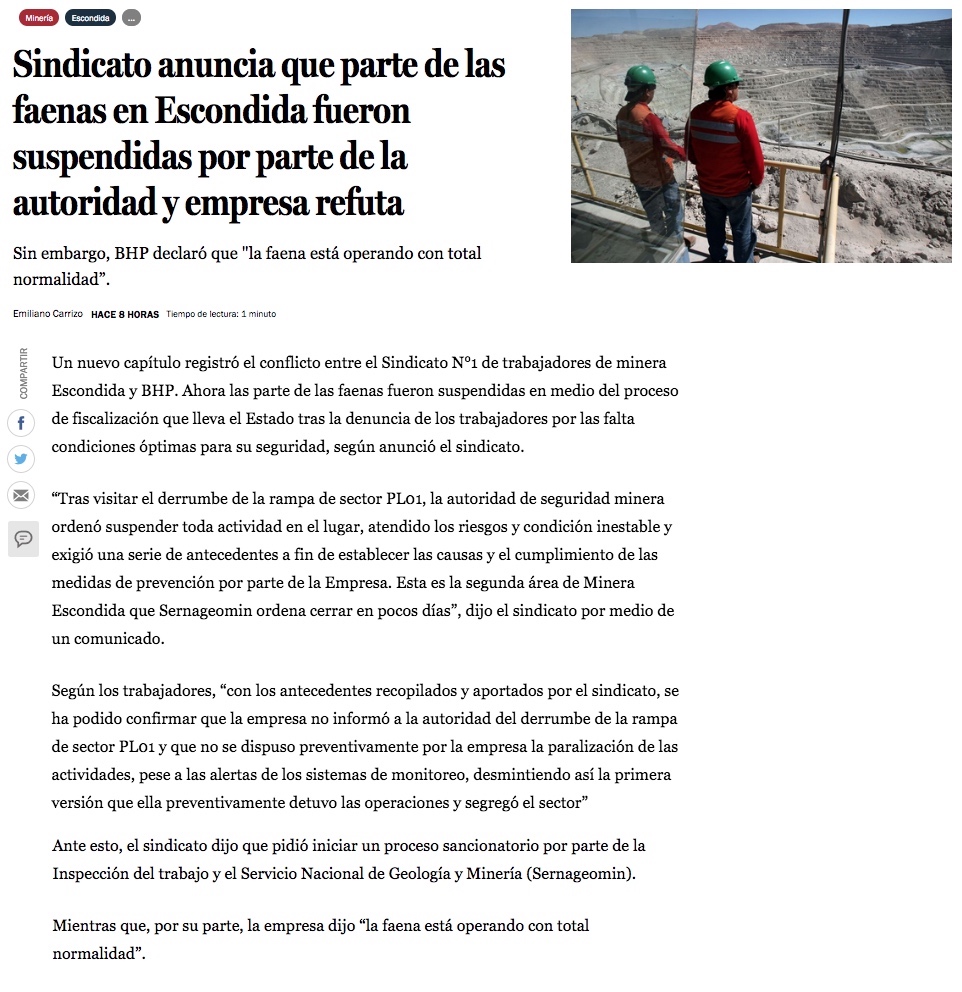 Sindicato de Escondida asegura que área de la minera suspendió faenas - (El Mercurio de Antofagasta)