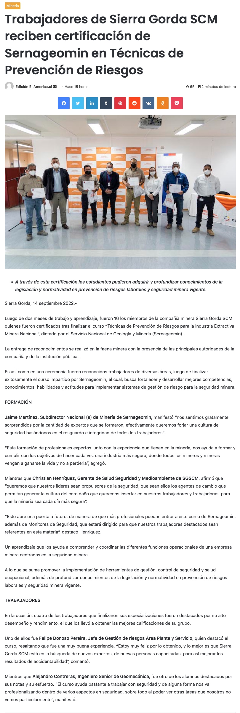 Trabajadores de Sierra Gorda se certificaron en Técnicas de Prevención de Riesgos - (portalminero)