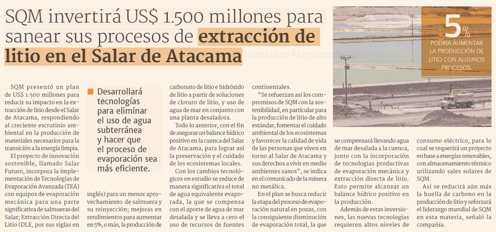 Proyecto de 1.500 millones de dólares de SQM busca producir litio con uso cero de agua dulce - (El Mercurio de Antofagasta)
