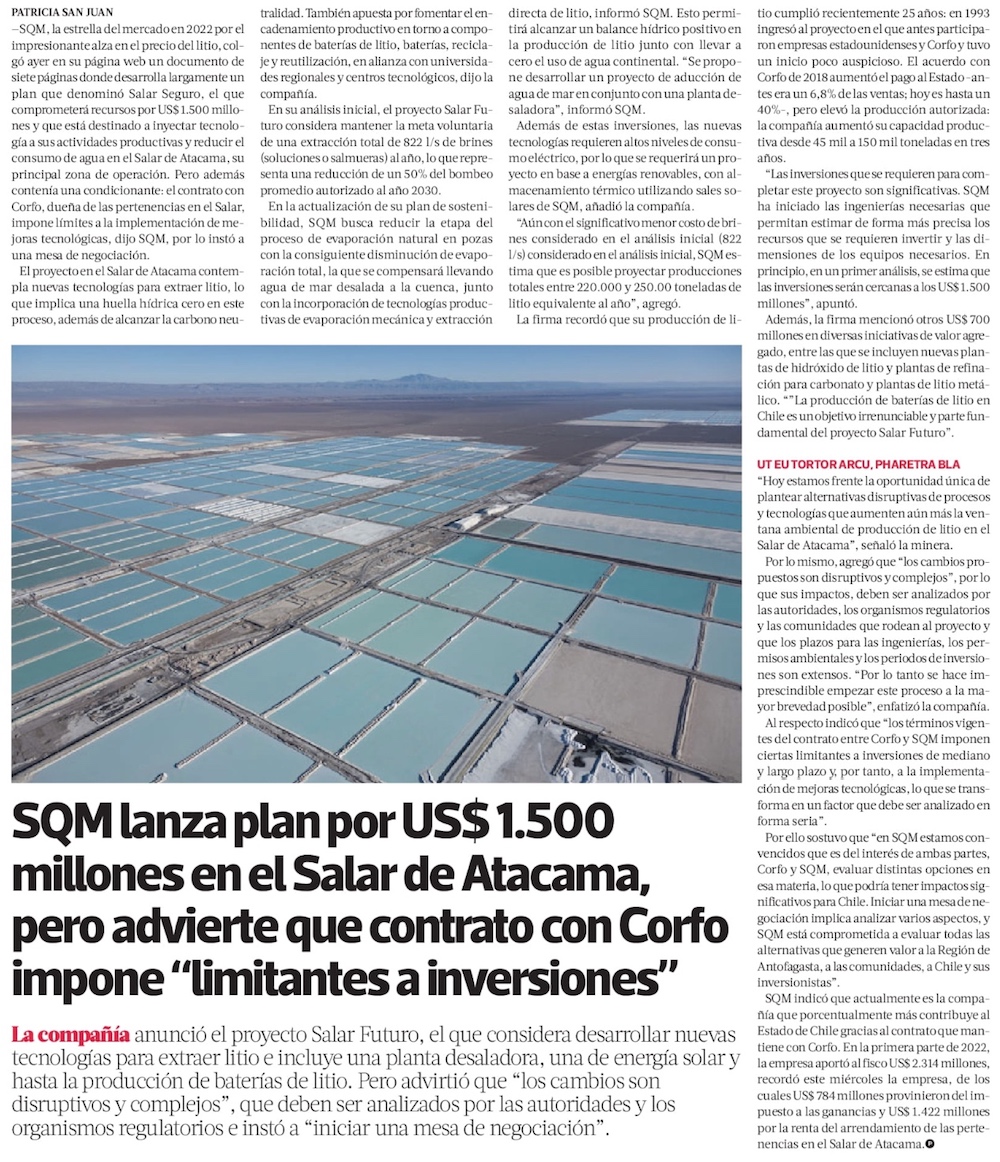 SQM invertirá US$ 1.500 millones para sanear sus procesos de extracción de litio en el Salar de Atacama - (Diario Financiero)