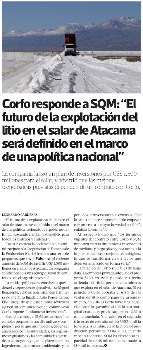 Corfo responde a SQM por contrato del Salar de Atacama, y minera se pone plazos para llegar a un acuerdo - (El Mercurio de Santiago)