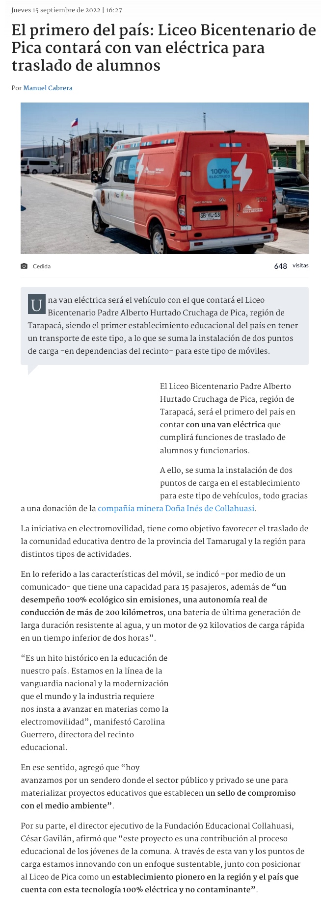 Liceo Bicentenario de Pica es el primer establecimiento del país en instalar un cargador rápido para incentivar la electromovilidad en Tarapacá - (Estrella de Iquique)