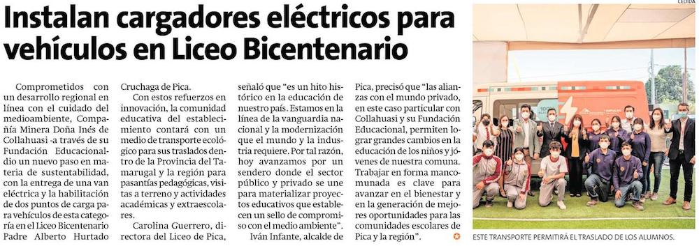 Liceo Bicentenario de Pica es el primer establecimiento del país en instalar un cargador rápido para incentivar la electromovilidad en Tarapacá - (Estrella de Iquique)