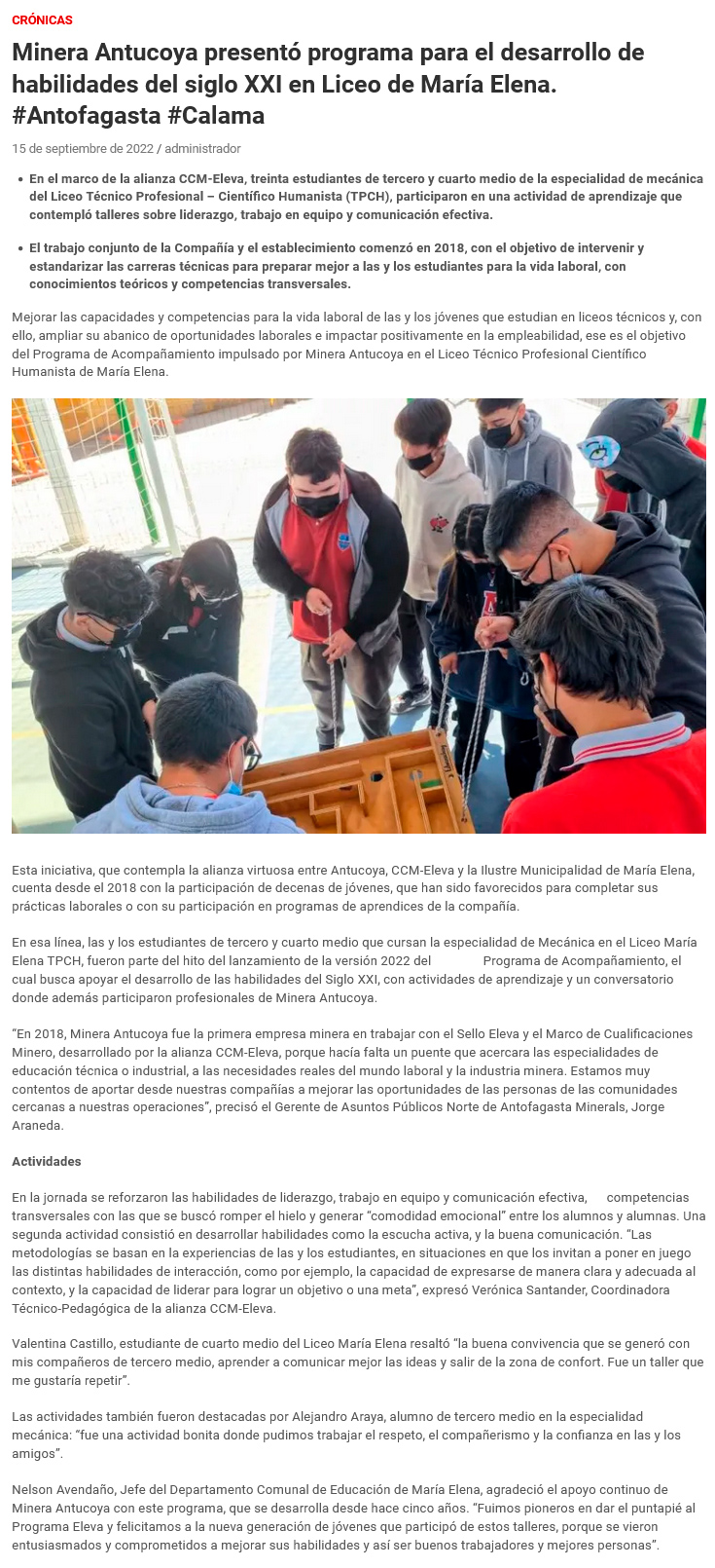 Minera Antucoya presentó programa para el desarrollo de habilidades del siglo XXI en Liceo de María Elena - (timeline)