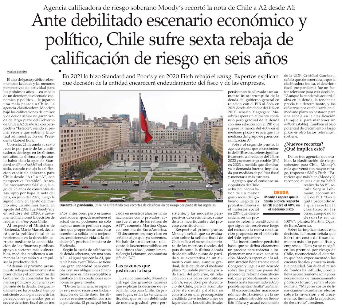 Moody's vuelve a bajar la clasificación crediticia de Chile por debilitamiento económico y fiscal - (Pulso)