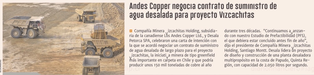 Minera Vizcachitas usará agua desalinizada - (La Segunda)