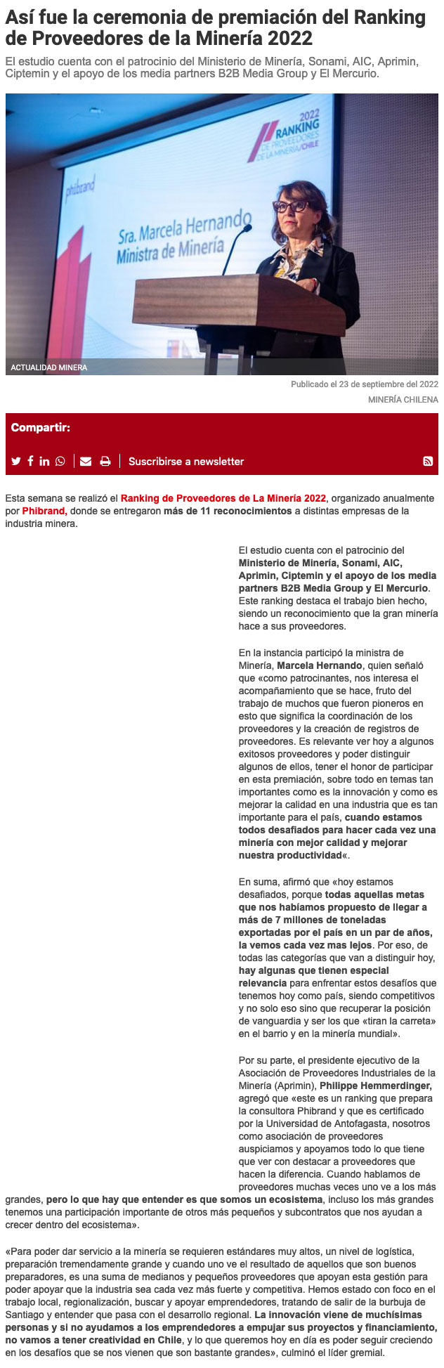 Ranking de proveedores de la minería 2022 premia a 11 empresas - (El Mercurio de Santiago)