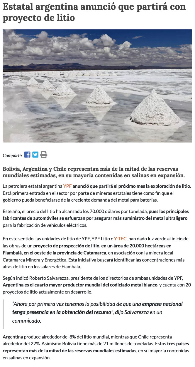 Estatal argentina YPF comienza la primera exploración de litio - (americaeconomia online)