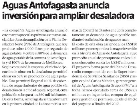 Aguas Antofagasta anuncia la expansión de planta de desalación - (Diario Financiero)