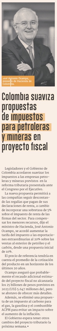 Colombia suaviza propuestas de impuestos para petroleras y mineras en proyecto fiscal - (americaeconomia online)