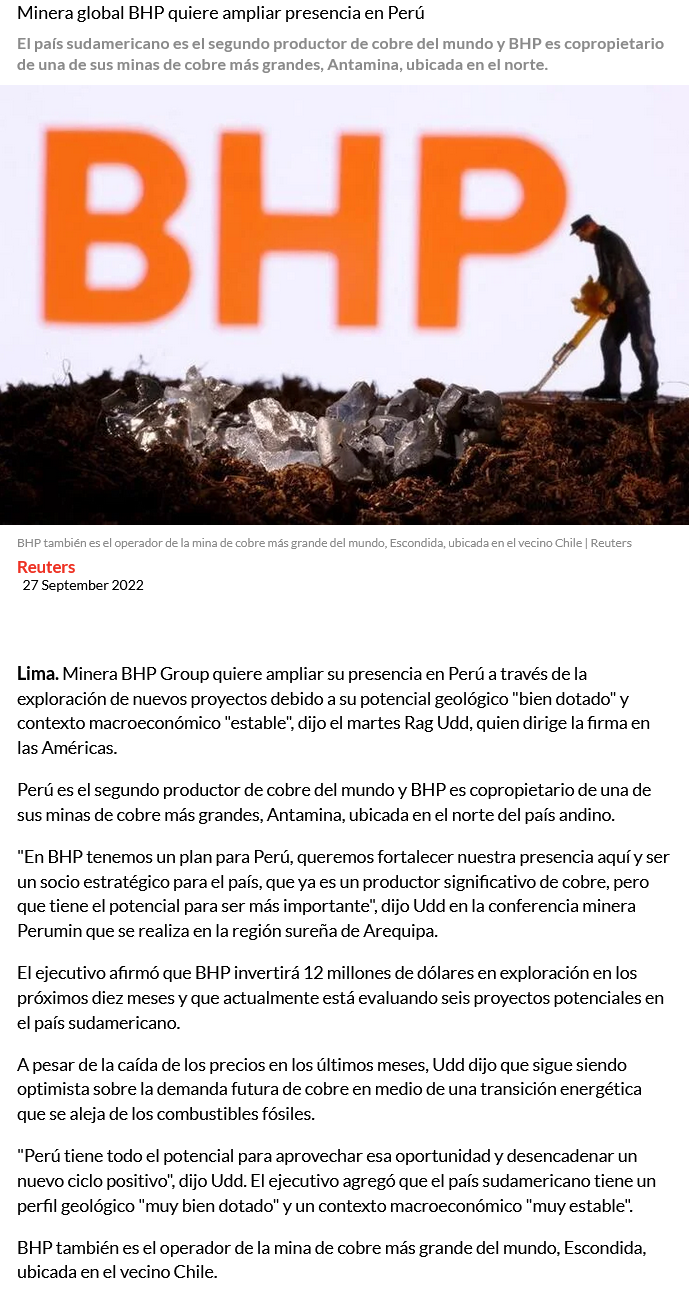 BHP dispuesta a "ampliar y hacer crecer" su rol en industria minera peruana - (Diario Financiero)