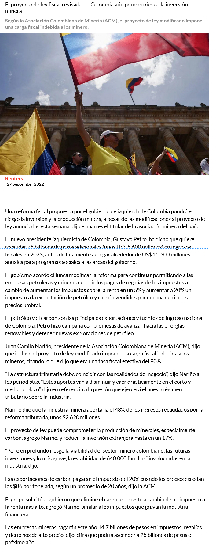 Colombia suaviza propuestas de impuestos para petroleras y mineras en proyecto fiscal - (Diario Financiero)