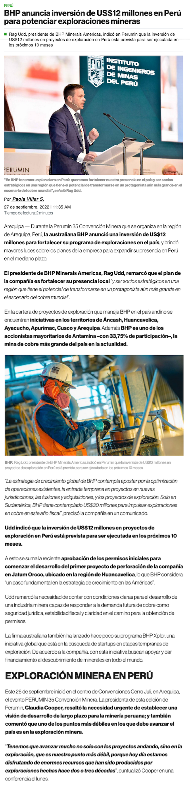 Minera global BHP quiere ampliar presencia en Perú - (americaeconomia online)