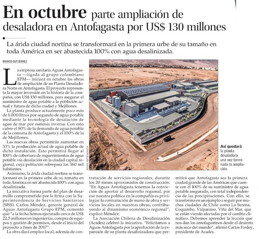 Aguas Antofagasta anuncia la expansión de planta de desalación - (Diario Financiero)