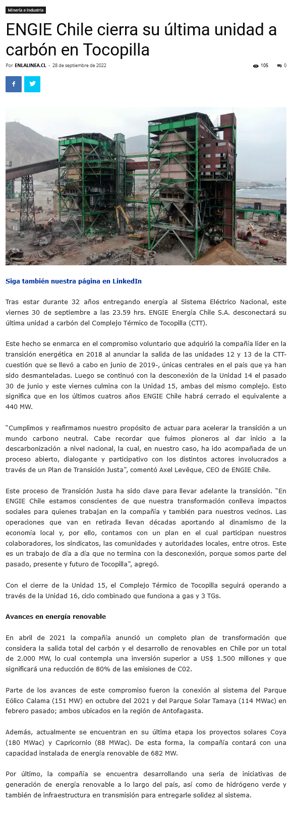 ENGIE Chile cierra su última unidad a carbón en Tocopilla - (Estrategia)