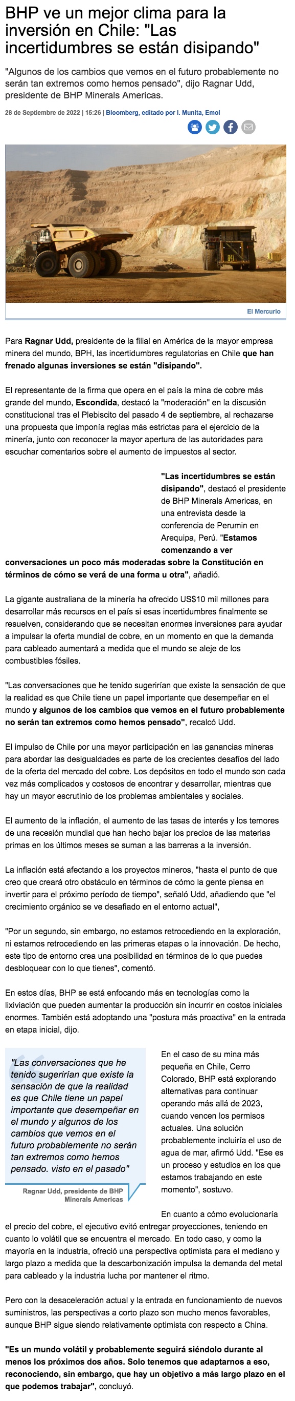 BHP considera que las incertidumbres en Chile se están disipando y que el clima de inversión será mejor - (Pulso)