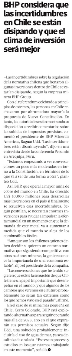 BHP ve un mejor clima para la inversión en Chile: "Las incertidumbres se están disipando" - (emol)