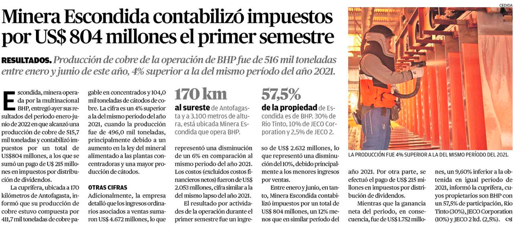 Escondida aumenta su producción a junio, pero ingresos caen 6% - (Diario Financiero)